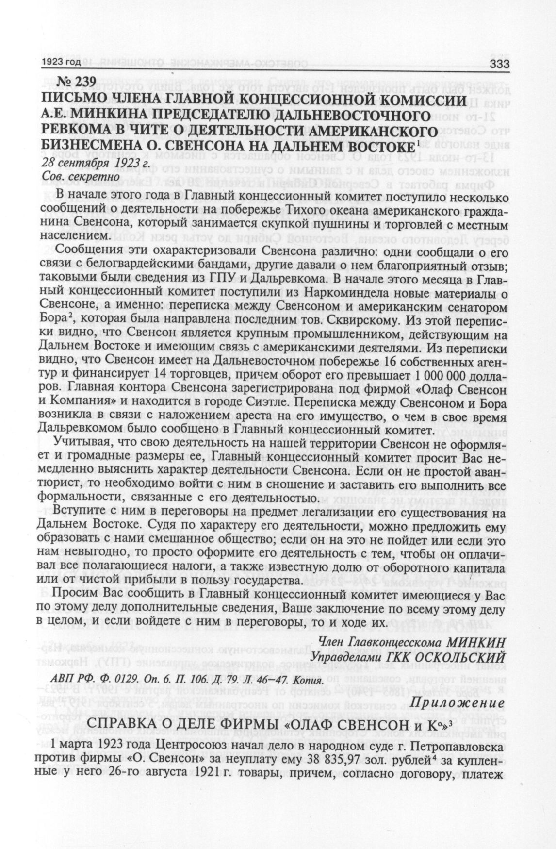Письмо члена Главной концессионной комиссии А.Е. Минкина председателю Дальневосточного ревкома в Чите о деятельности американского бизнесмена О. Свенсона на Дальнем Востоке. 28 сентября 1923 г. // АВП РФ. Ф. 0129. Oп. 6. П. 106. Д. 79. Л. 46-47. Копия.