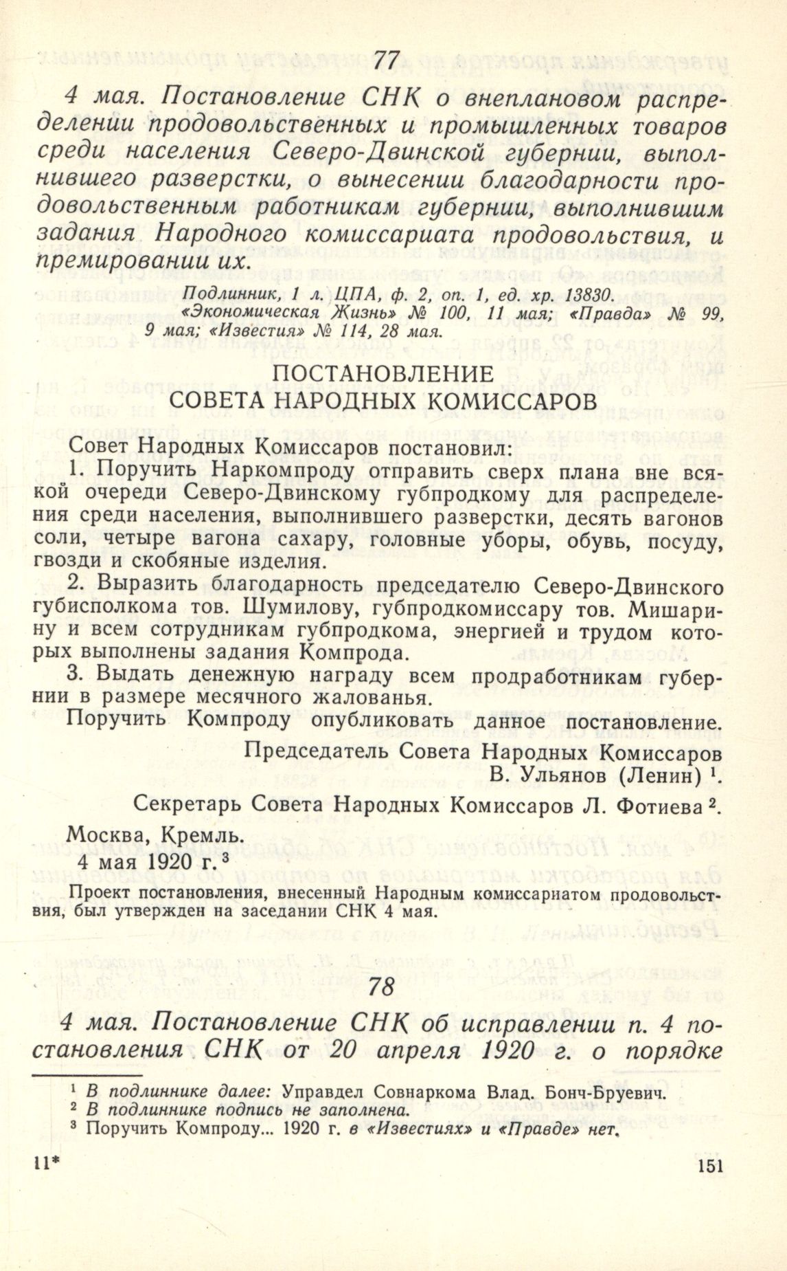 4 мая. Постановление СНК об исправлении п. 4 постановления СНК от 20 апреля 1920 г. о порядке утверждения проектов по строительству промышленных сооружений // Подлинник, 1 л.; пометка: 467/6. ЦПА, ф. 2, оп. 1, ед. хр. 13822. «Известия» № 97, 7 мая.