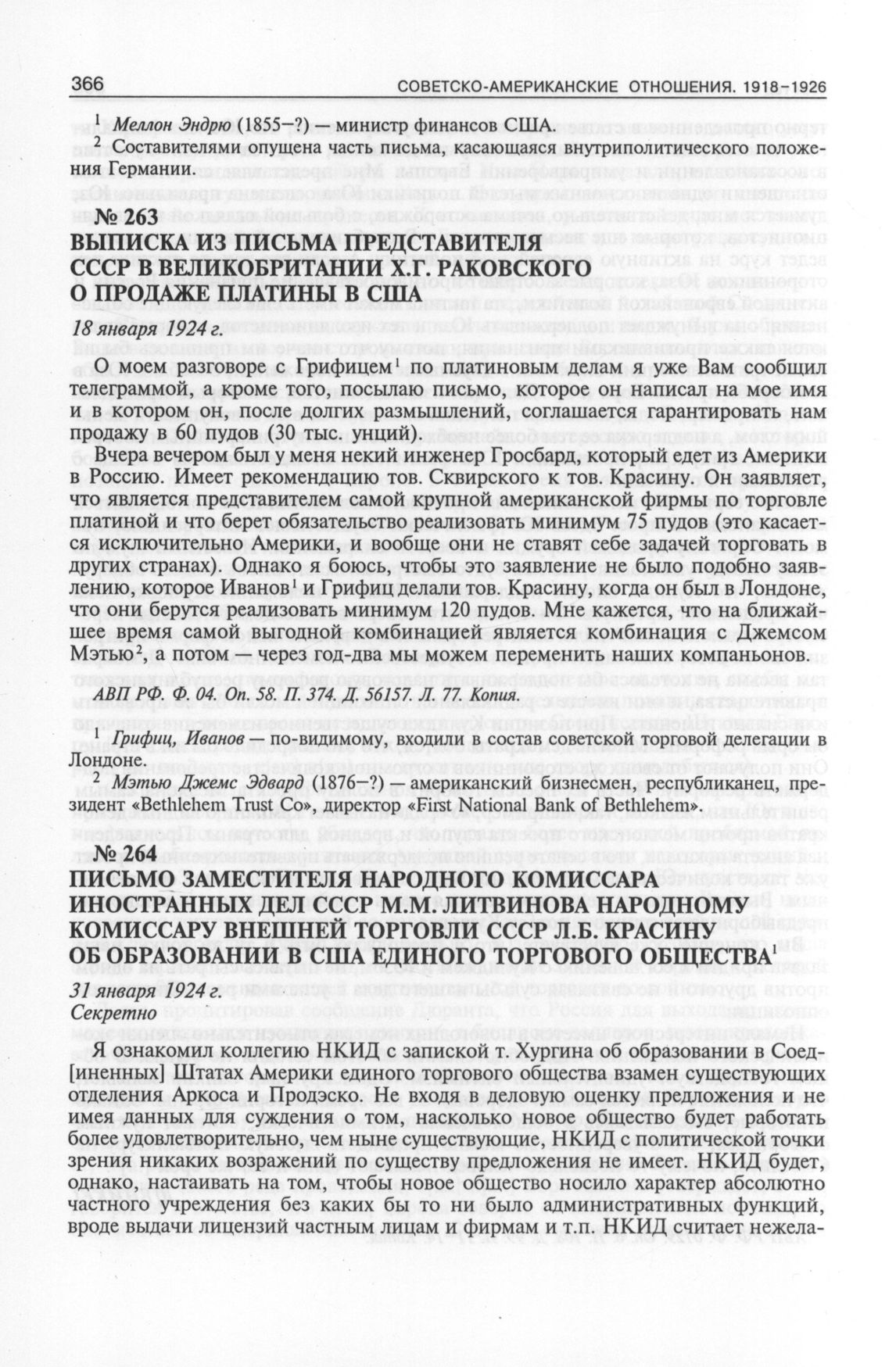 Выписка из письма представителя СССР в Великобритании Х.Г. Ваковского о продаже платины в США. 18 января 1924 г. // АВП РФ. Ф. 04. Oп. 58. П. 374. Д. 56157. Л. 77. Копия.