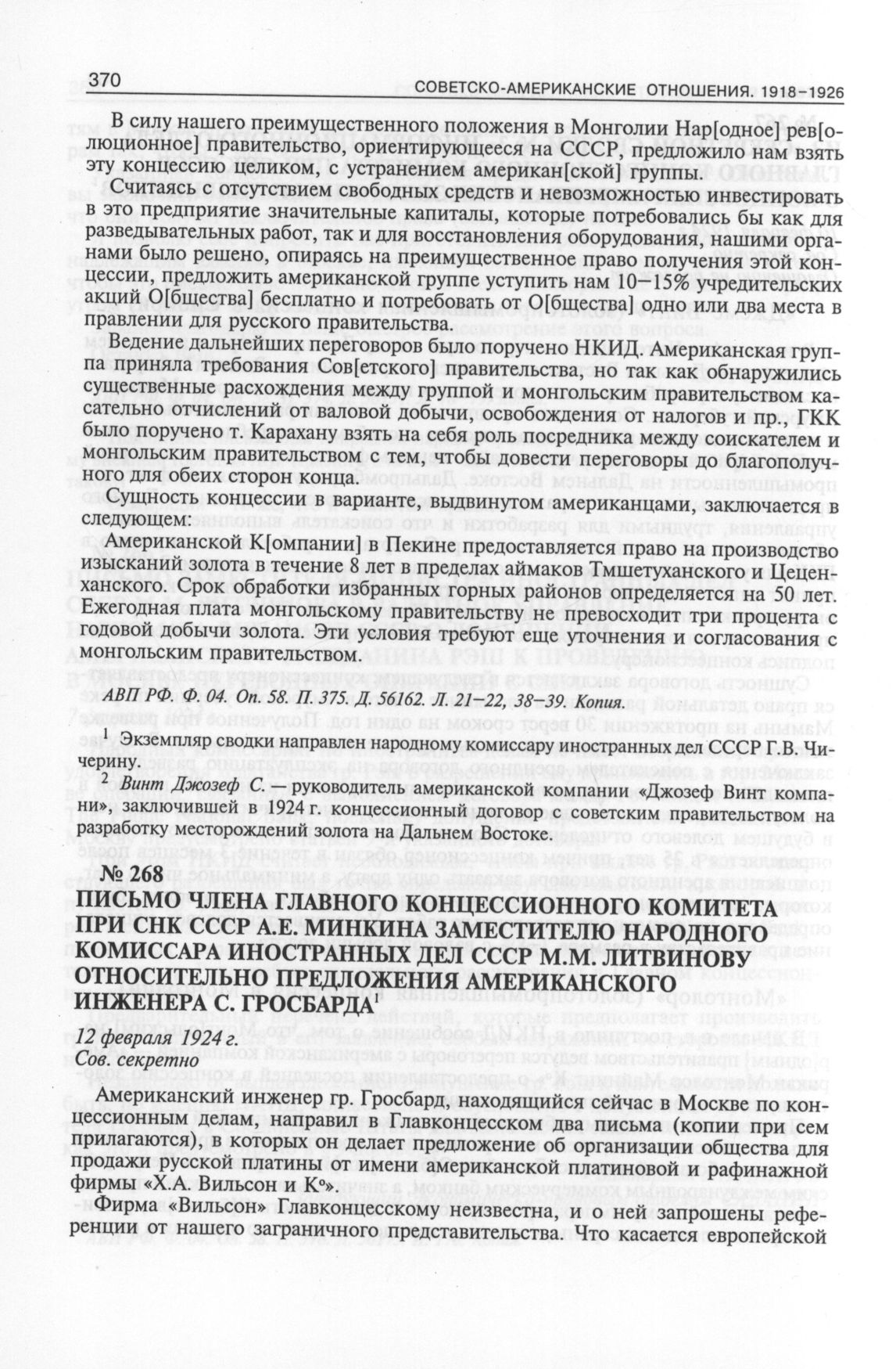 Письмо члена Главного концессионного комитета при СНК СССР А.Е. Минкина заместителю народного комиссара иностранных дел СССР М.М. Литвинову относительно предложения американского инженера С. Гросбарда. 12 февраля 1924 г. // АВП РФ. Ф. 04. Oп. 58. П. 374. Д. 56157. Л. 103—104 + оборот, 105 + оборот. Копия.