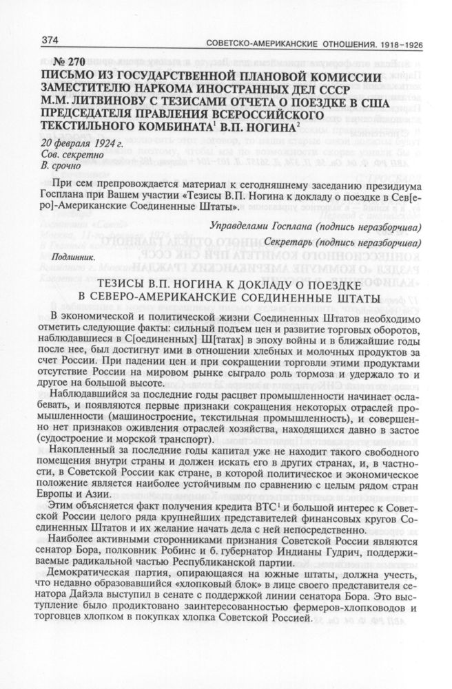 Письмо из Государственной плановой комиссии заместителю наркома иностранных дел СССР М.М. Литвинову с тезисами отчета о поездке в США председателя правления Всероссийского текстильного комбината В.П. Ногина. 20 февраля 1924 г. // АВП РФ. Ф. 04. Oп. 58. П. 375. Д. 56169. Л. 3, 4 + оборот, 5 + оборот, 6-7, 8 + оборот. Копия.
