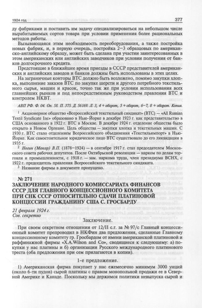 Заключение Народного комиссариата финансов СССР для Главного концессионного комитета при СНК СССР относительно сдачи платиновой концессии гражданину США С. Гросбарду. 21 февраля 1924 г. // АВП РФ. Ф. 04. Oп. 58. П. 374. Д. 56157. Л. 125-127. Копия.