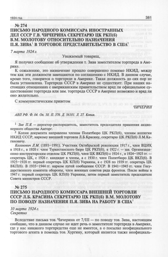 Письмо народного комиссара внешней торговли СССР Л.Б. Красина секретарю ЦК РКП(б) В.М. Молотову по поводу назначения П.Я. Зива на работу в США. 10 марта 1924 г. // АВП РФ. Ф. 04. Oп. 58. П. 374. Д. 101. Л. 54 Копия.