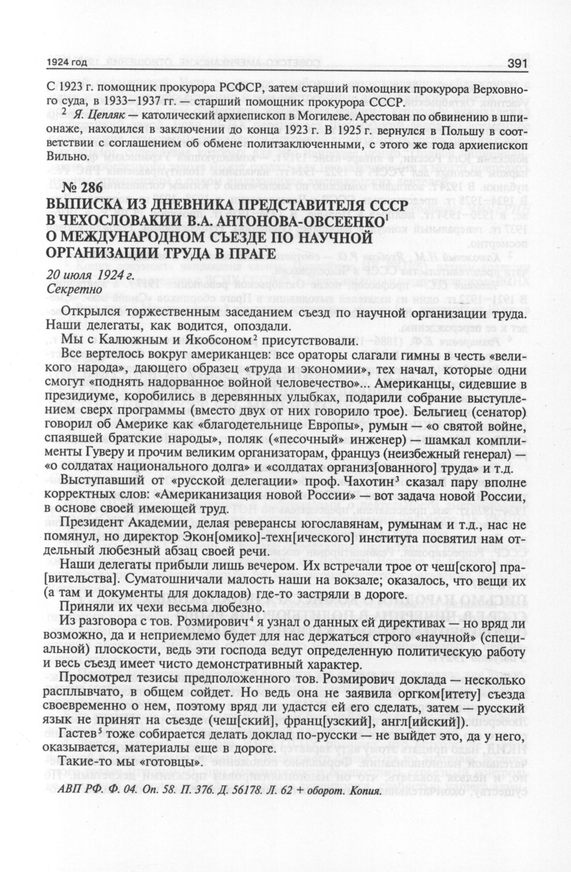 Выписка из дневника представителя СССР в Чехословакии В.А. Антонова- Овсеенко о международном съезде по научной организации труда в Праге. 20 июля 1924 г. // АВП РФ. Ф. 04. Oп. 58. П. 376. Д. 56178. Л. 62 + оборот. Копия.