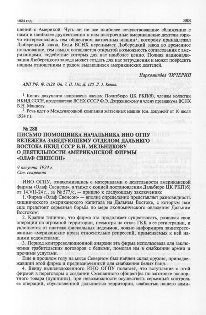 Письмо помощника начальника ИНО ОГПУ Вележева заведующему Отделом Дальнего Востока НКИД СССР Б.Н. Мельникову о деятельности американской фирмы «Олаф Свенсон». 9 августа 1924 г. // АВП РФ. Ф. 0129. Oп. 6. П. 106. Д. 79. Л. 51-57. Копия.