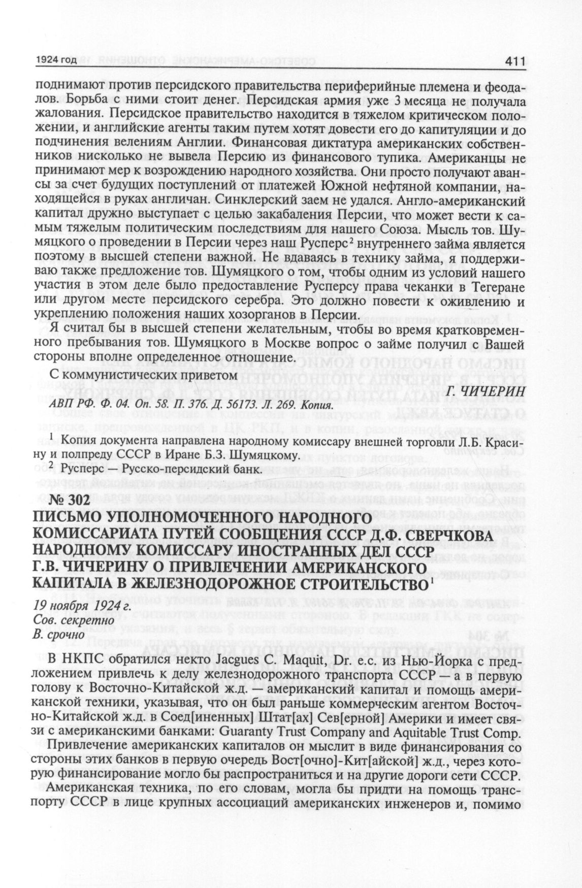 Письмо уполномоченного Народного комиссариата путей сообщения СССР Д.Ф. Сверчкова народному комиссару иностранных дел СССР Г.В. Чичерину о привлечении американского капитала в железнодорожное строительство. 19 ноября 1924 г. // АВП РФ. Ф. 04. Oп. 58. П. 376. Д. 56181. Л. 111 + оборот. Подлинник.