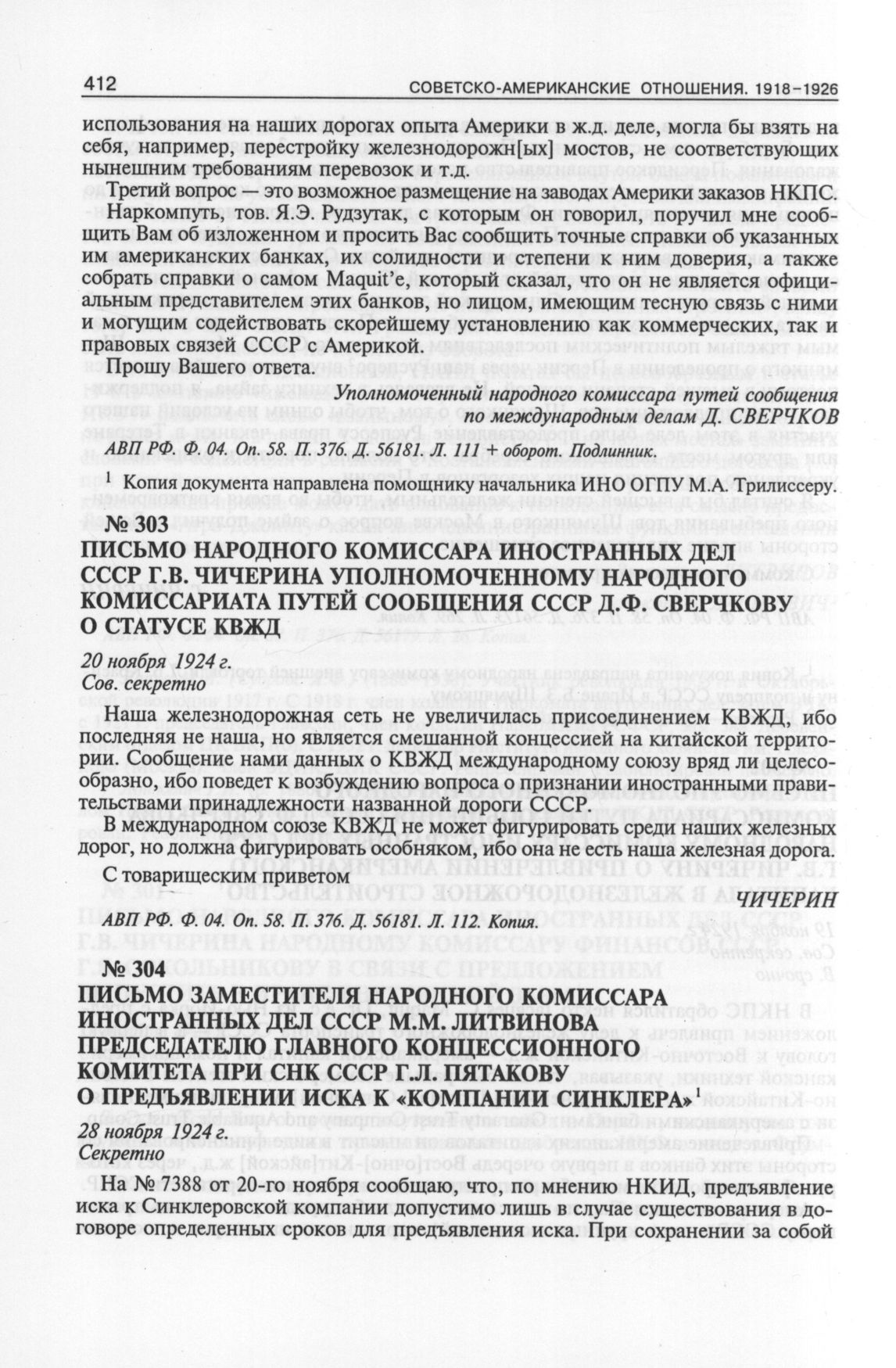 Письмо заместителя народного комиссара иностранных дел СССР М.М. Литвинова председателю Главного концессионного комитета при СНК СССР Г.Л. Пятакову о предъявлении иска к компании «Синклера». 28 ноября 1924 г. // АВП РФ. Ф. 0129. Oп. 6. П. 106. Д. 77. Л. 30. Копия.