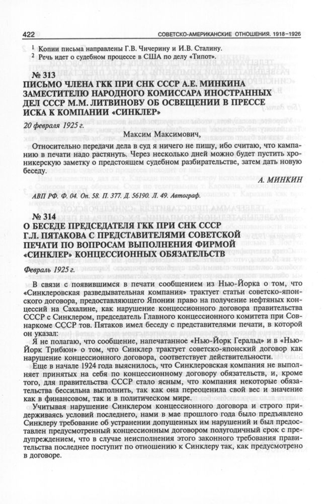 О беседе председателя ГКК при СНК СССР Г.Л. Пятакова с представителями советской печати по вопросам выполнения фирмой «Синклер» концессионных обязательств. Февраль 1925 г. // АВП РФ. Ф. 04. Oп. 58. П. 377. Д. 56190. Л. 50.