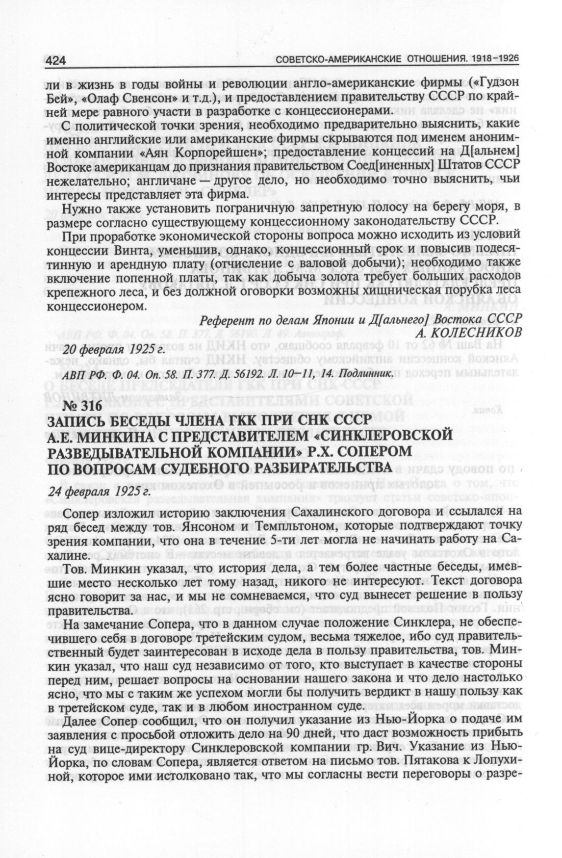 Запись беседы члена ГКК при СНК СССР А.Е. Минкина с представителем «Синклеровской разведывательной компании» Р.Х. Сопером по вопросам судебного разбирательства с концессионером. 24 февраля 1925 г. // АВП РФ. Ф. 04. Oп. 58. П. 377. Д. 56140. Л. 65-67. Копия.