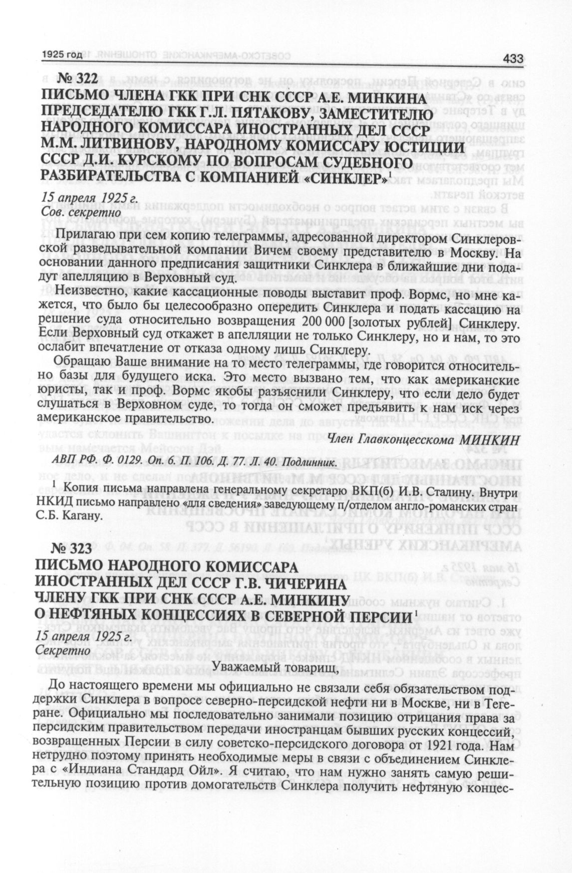 Письмо народного комиссара иностранных дел СССР Г.В. Чичерина члену ГКК при СНК СССР А.Е. Минкину о нефтяных концессиях в Северной Персии. 15 апреля 1925 г. // АВП РФ. Ф. 04. Oп. 58. П. 377. Д. 56192. Л. 25. Копия.