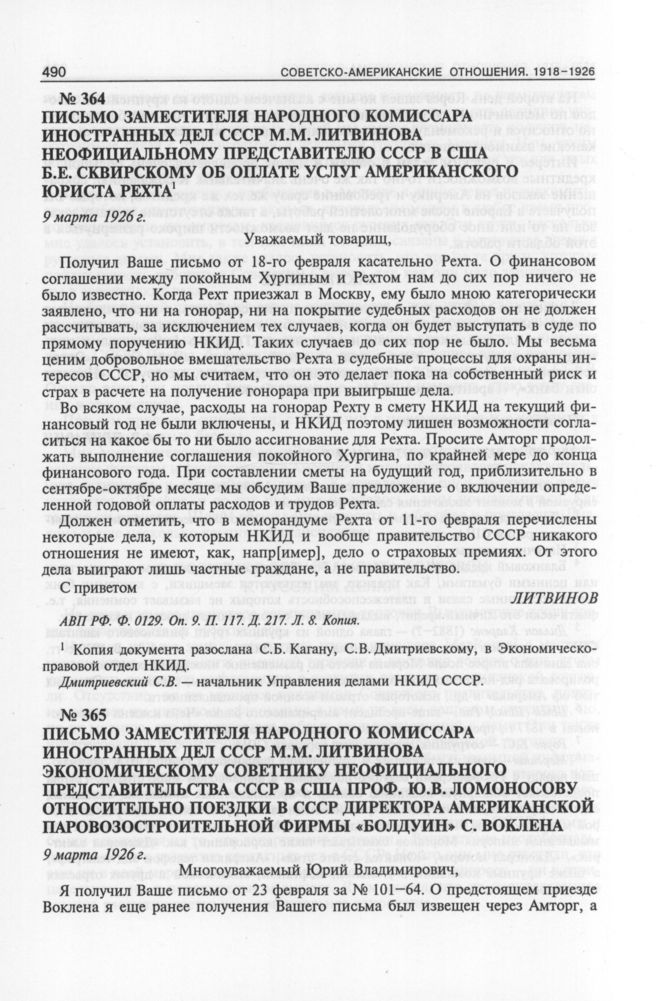Письмо заместителя народного комиссара иностранных дел СССР М.М. Литвинова неофициальному представителю СССР в США Б.Е. Сквирскому об оплате услуг американского юриста Ч. Рехта. 9 марта 1926 г. // АВП РФ. Ф. 0129. Oп. 9. П. 117. Д. 217. Л. 8. Копия.
