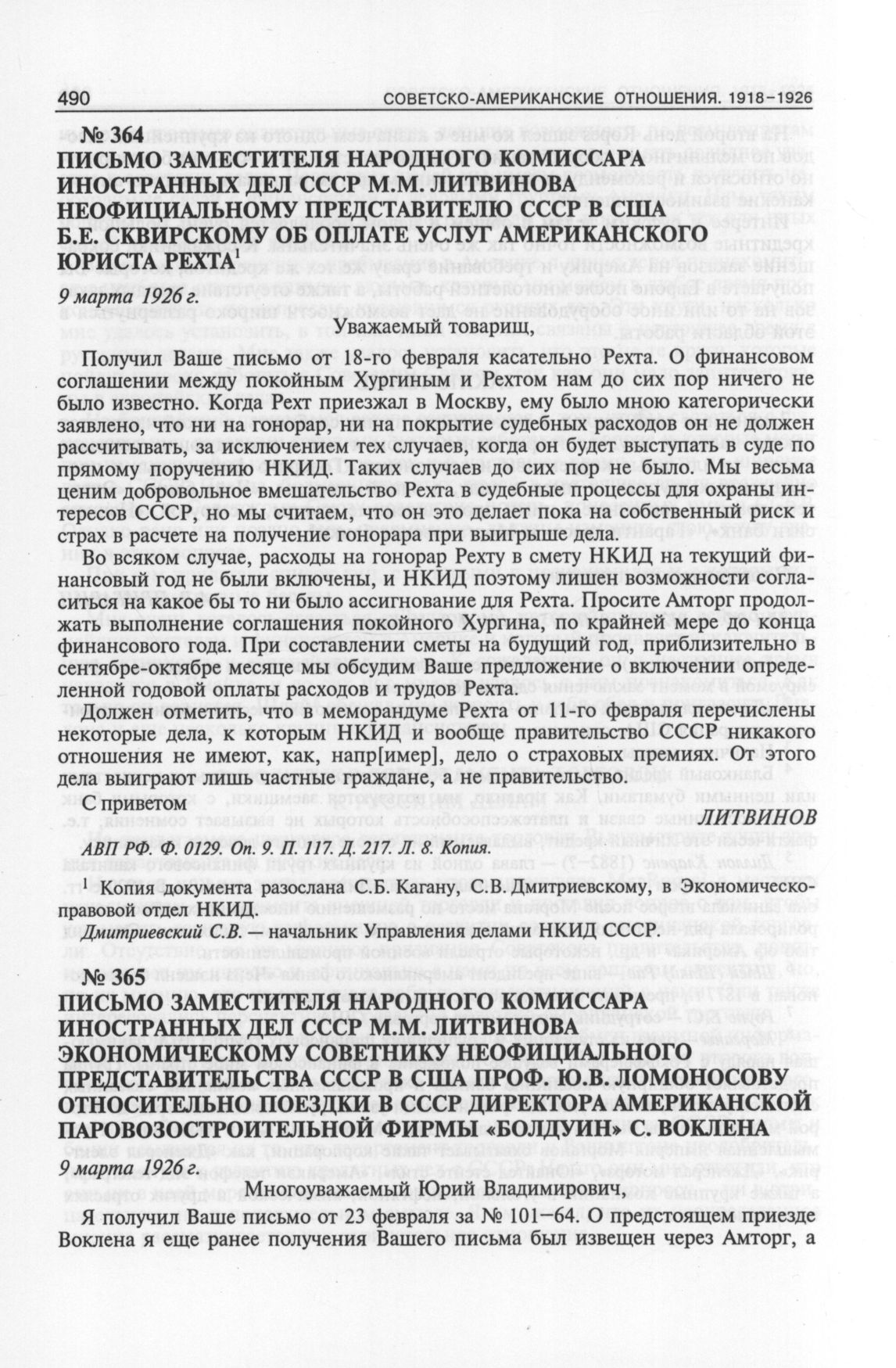 Письмо заместителя народного комиссара иностранных дел СССР М.М. Литвинова экономическому советнику неофициального представительства СССР в США проф. Ю.В. Ломоносову относительно поездки в СССР директора американской паровозостроительной фирмы «Болдуин» С. Воклена. 9 марта 1926 г. // АВП РФ. Ф. 0129. Oп. 9. П. 115. Д. 192. Л. 8. Копия.