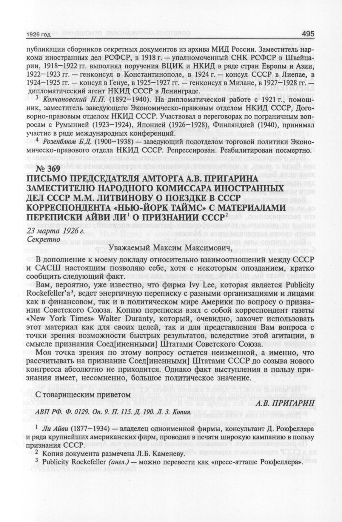 Письмо председателя Амторга А.В. Пригарина заместителю народного комиссара иностранных дел СССР М.М. Литвинову о поездке в СССР корреспондента «Нью-Йорк таймс» с материалами переписки Айви Ли о признании СССР. 23 марта 1926 г. // АВП РФ. Ф. 0129. Oп. 9. П. 115. Д. 190. Л. 3. Копия.