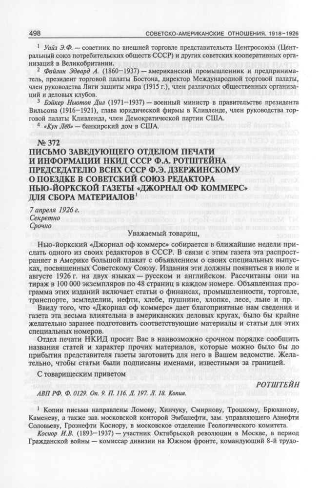 Письмо заведующего Отделом печати и информации НКИД СССР Ф.А. Ротштейна председателю ВСНХ СССР Ф.Э. Дзержинскому о поездке в Советский Союз редактора нью-йоркской газеты «Джорнал оф коммерс» для сбора материалов. 7 апреля 1926 г. // АВП РФ. Ф. 0129. Oп. 9. П. 116. Д. 197. Л. 18. Копия.