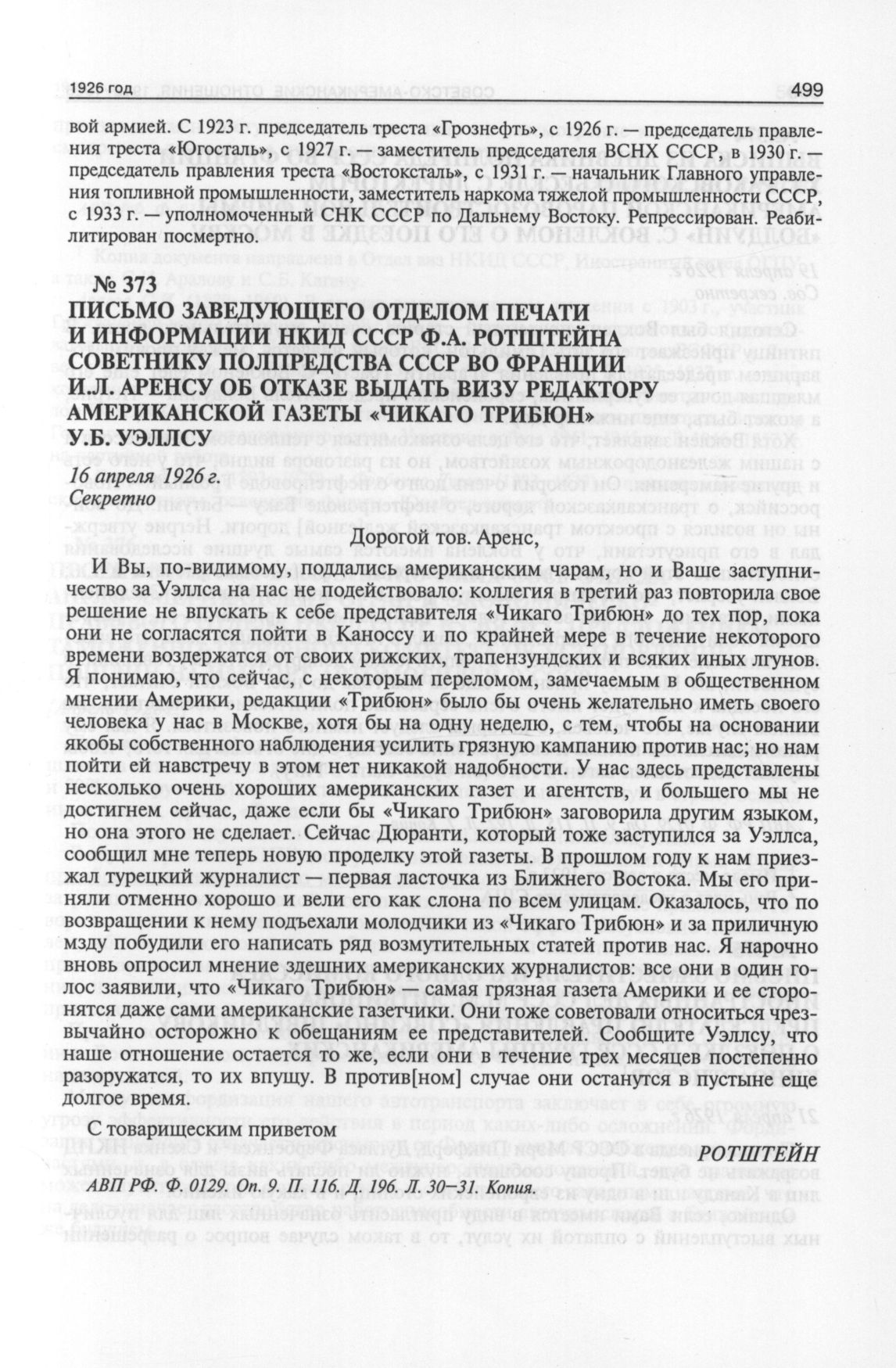 Письмо заведующего Отделом печати и информации НКИД СССР Ф.А. Ротштейна советнику полпредства СССР во Франции И.Л. Аренсу об отказе выдать визу редактору американской газеты «Чикаго трибюн» У.Б. Уэллсу. 16 апреля 1926 г. // АВП РФ. Ф. 0129. Oп. 9. П. 116. Д. 196. Л. 30-31. Копия.