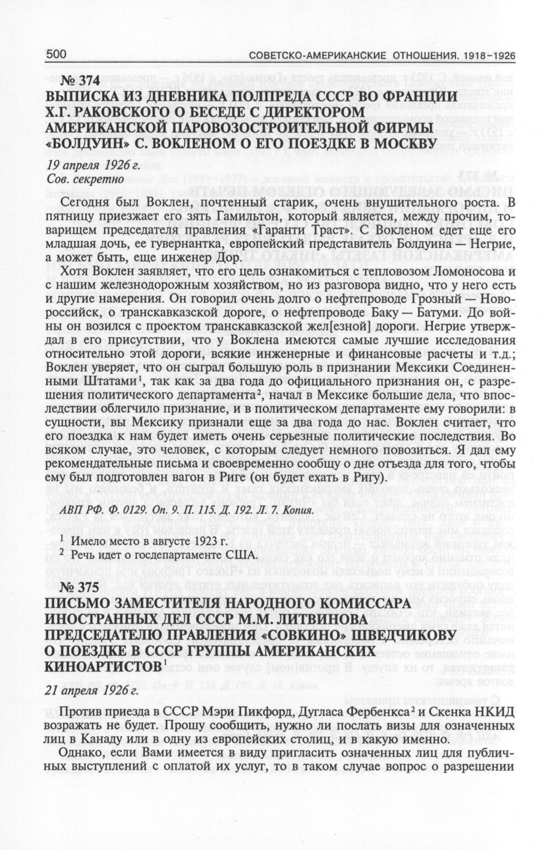 Выписка из дневника полпреда СССР во Франции Х.Г. Раковского о беседе с директором американской паровозостроительной фирмы «Болдуин» С. Вокленом о его поездке в Москву. 19 апреля 1926 г. // АВП РФ. Ф. 0129. Oп. 9. П. 115. Д. 192. Л. 7. Копия.