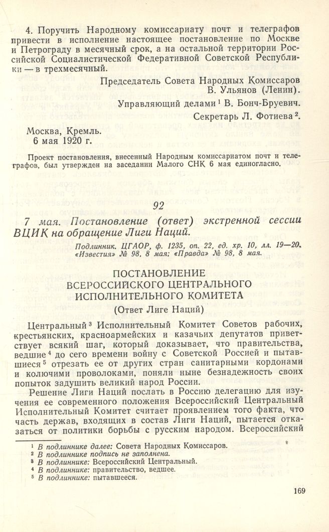 7 мая. Постановление (ответ) экстренной сессии ВЦИК на обращение Лиги Наций