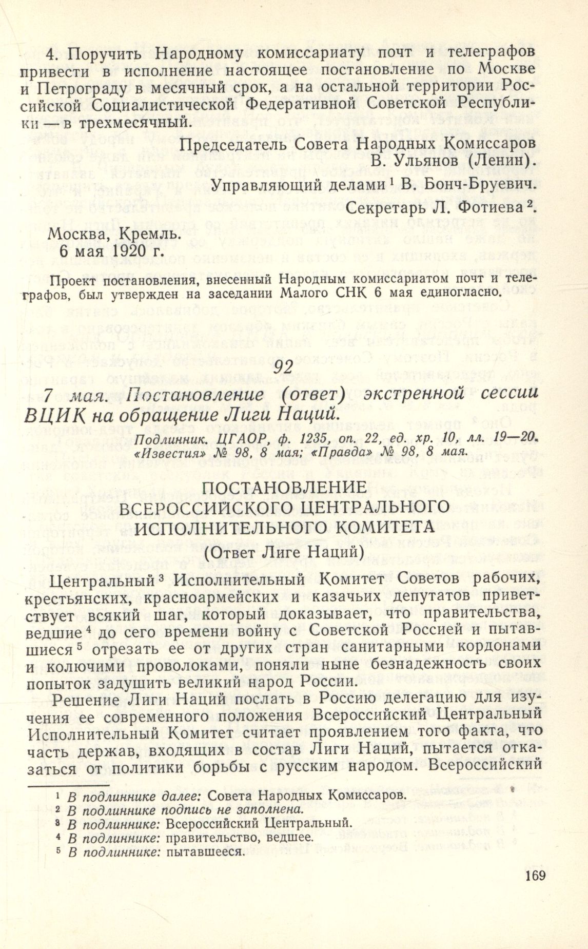 7 мая. Постановление (ответ) экстренной сессии ВЦИК на обращение Лиги Наций // Подлинник. ЦГАОР, ф. 1235, оп. 22, ед. хр. 10, лл. 19—20. «Известия» № 98, 8 мая; «Правда» № 98, 8 мая.