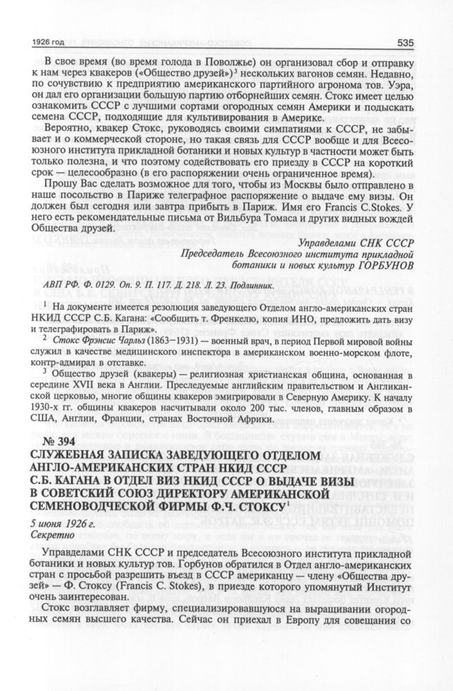 Служебная записка заведующего Отделом англо-американских стран НКИД СССР С.Б. Кагана в Отдел виз НКИД СССР о выдаче визы в Советский Союз директору американской семеноводческой фирмы Ф.Ч. Стоксу. 5 июня 1926 г. // АВП РФ. Ф. 0129. Oп. 9. П. 117. Д. 218. Л. 24 + оборот, 25.