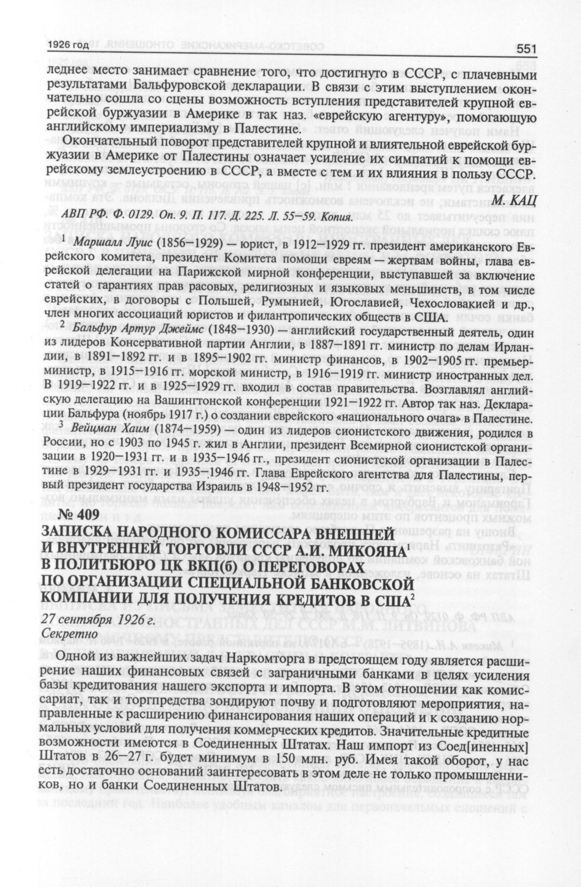 Записка народного комиссара внешней и внутренней торговли СССР А.И. Микояна в Политбюро ЦК ВКП(б) о переговорах по организации специальной банковской компании для получения кредитов в США. 27 сентября 1926 г. // АВП РФ. Ф. 0129. Oп. 9. П. 116. Д. 200. Л. 29-30. Копия.