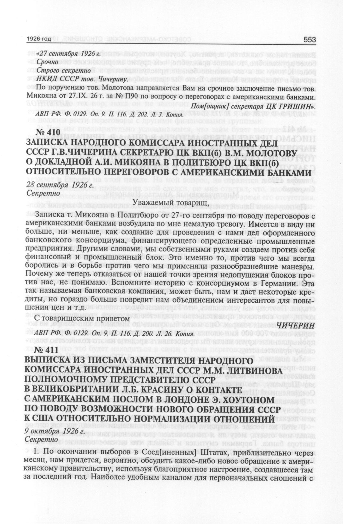 Записка народного комиссара иностранных дел СССР Г.В. Чичерина секретарю ЦК ВКП(б) В.М. Молотову о докладной А.И. Микояна в Политбюро ЦК ВКП(б) относительно переговоров с американскими банками. 28 сентября 1926 г. // АВП РФ. Ф. 0129. Oп. 9. П. 116. Д. 200. Л. 26. Копия.