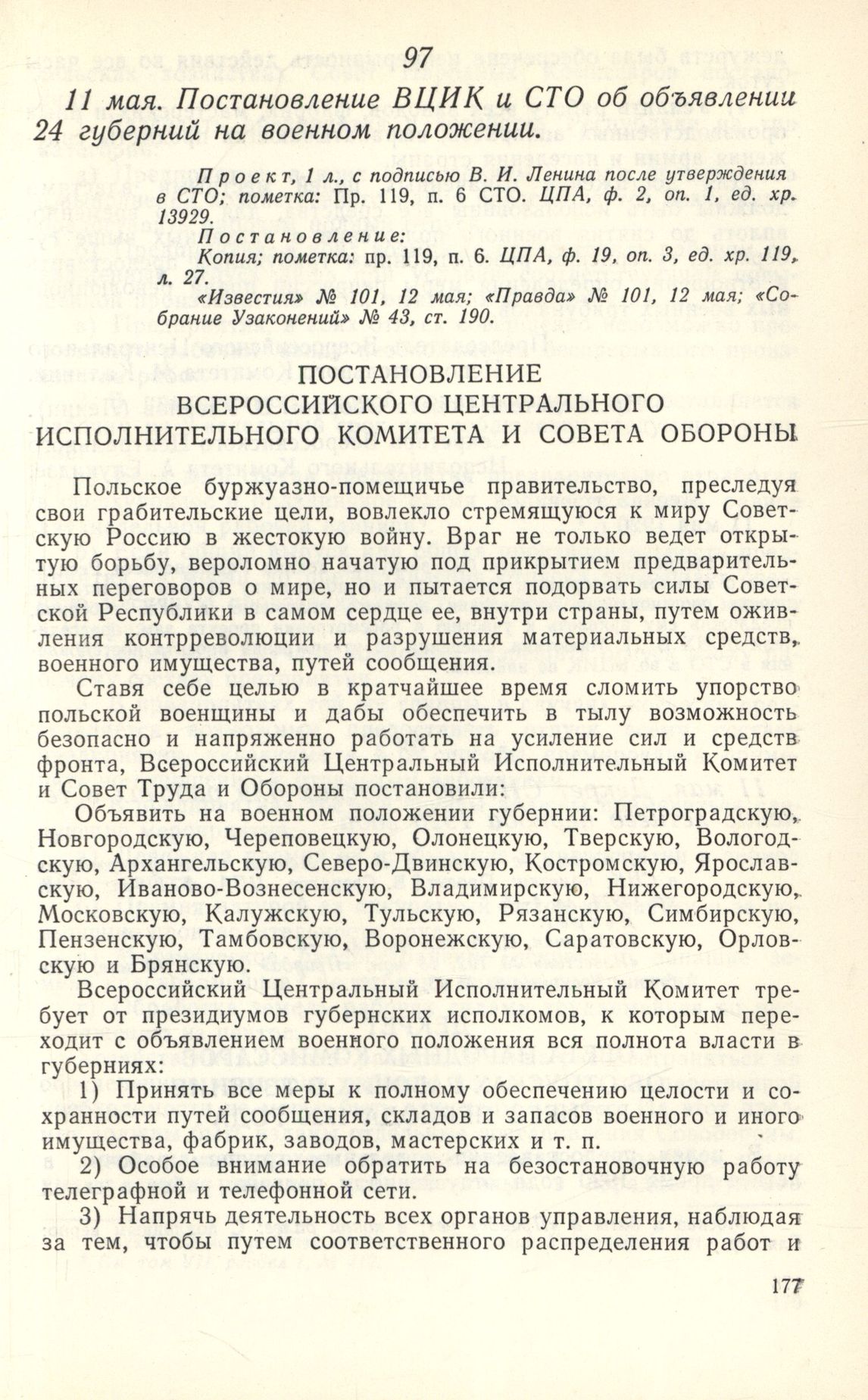 11 мая. Постановление ВЦИК и СТО об объявлении 24 губерний на военном положении // П р о е к т, 1 л., с подписью В. И. Ленина после утверждения в СТО; пометка: Пр. 119, п. 6 СТО. ЦПА, ф. 2, оп. 1, ед. хр. 13929. П о с т а н о в л е н и е: Копия; пометка: пр. 119, п. 6. ЦПА, ф. 19, оп. 3, ед. хр. 119, л. 27. «Известия» № 101, 12 мая; «Правда» № 101, 12 мая; «Собрание Узаконений» № 43, ст. 190.