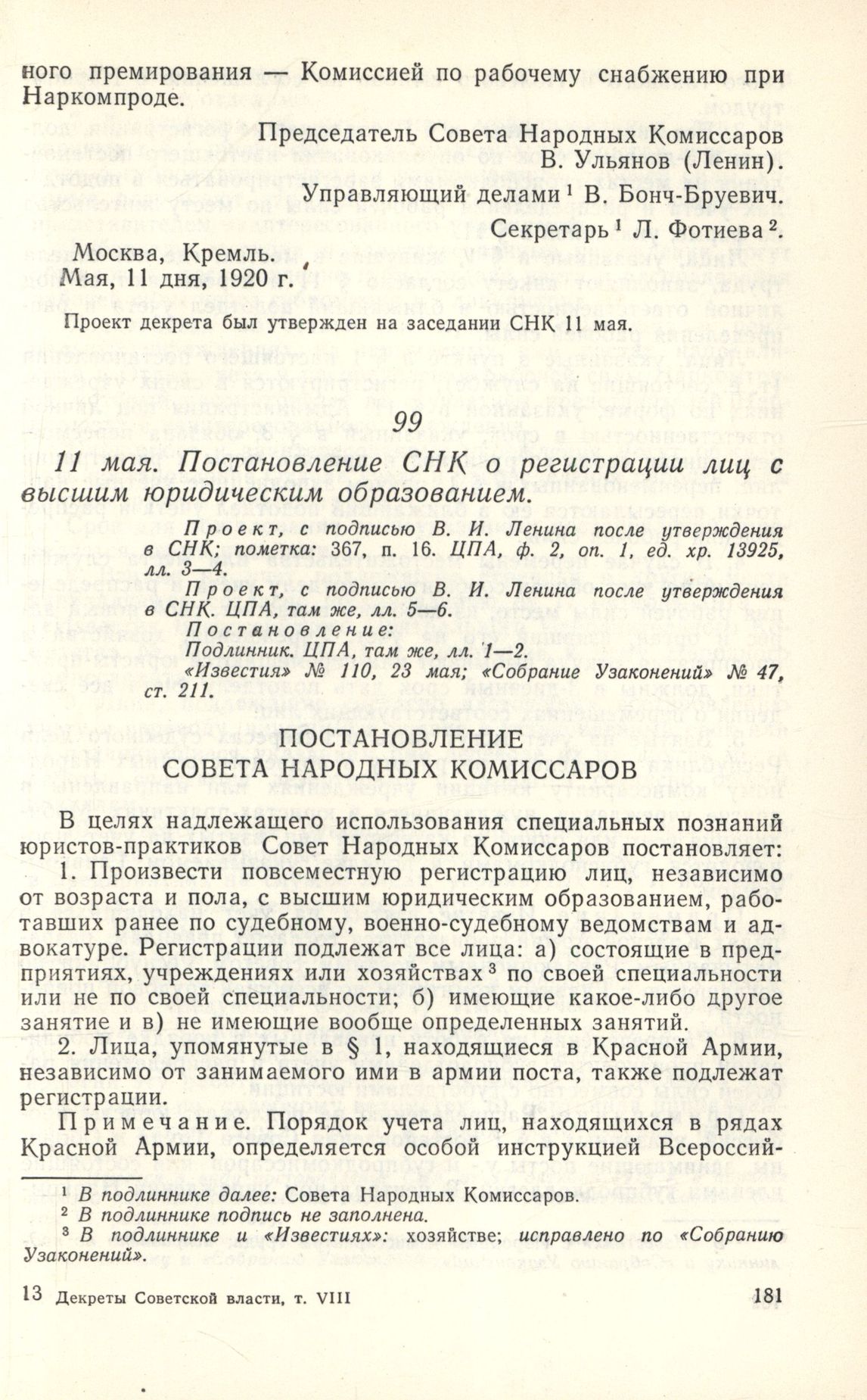 11 мая. Постановление СНК о регистрации лиц с высшим юридическим образованием // П р о е к т, с подписью В. И. Ленина после утверждения в СНК; пометка: 367, п. 16. ЦПА, ф. 2, оп. 1, ед. хр. 13925, лл. 3—4. П р о е к т, с подписью В. И. Ленина после утверждения в СНК. ЦПА, там же, лл. 5—6. П о с т а н о в л е н и е: Подлинник. ЦПА, там же, лл. 1—2. «Известия» № 110, 23 мая; «Собрание Узаконений» № 47, ст. 211.