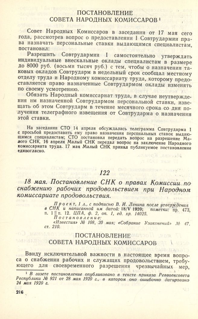 18 мая. Постановление СНК о правах Комиссии по снабжению рабочих продовольствием при Народном комиссариате продовольствия // П р о е к т, 1 л., с подписью В. И. Ленина после утверждения в СНК и написанной им датой: 18/V 1920; пометки: пр. 473, п. 1 || п. 12. ЦПА, ф. 2, оп. 1, ед. хр. 14025. П о с т а н о в л е н и е: «Известия» № 108, 20 мая; «Собрание Узаконений» № 47, ст. 210.
