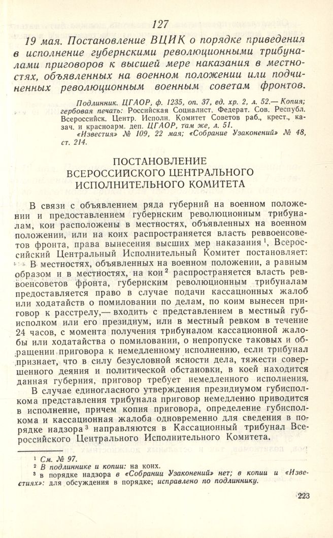 19 мая. Постановление ВЦИК о порядке приведения в исполнение губернскими революционными трибуналами приговоров к высшей мере наказания в местностях, объявленных на военном положении или подчиненных революционным военным советам фронтов // Подлинник. ЦГАОР, ф. 1235, оп. 37, ед. хр. 2, л. 52.— Копия; гербовая печать: Российская Социалист. Федерат. Сов. Республ. Всероссийск. Центр. Исполн. Комитет Советов раб., крест., казач. и красноарм. деп. ЦГАОР, там же, л. 51. «Известия» № 109, 22 мая; «Собрание Узаконений» № 48, ст. 214.