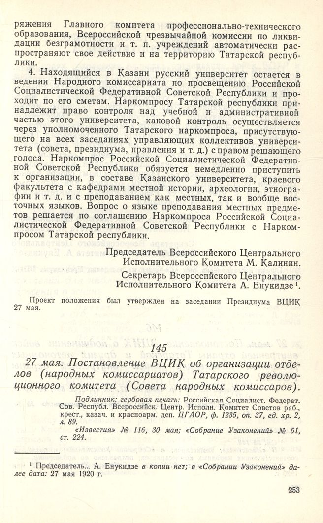 27 мая. Постановление ВЦИК об организации отделов (народных комиссариатов) Татарского революционного комитета (Совета народных комиссаров) // Подлинник; гербовая печать: Российская Социалист. Федерат. Сов. Республ. Всероссийск. Центр. Исполн. Комитет Советов раб.,крест., казач. и красноарм. деп. ЦГАОР, ф. 1235, оп. 37, ед. хр. 2, л. 89. «Известия» № 116, 30 мая; «Собрание Узаконений» №51, ст. 224.