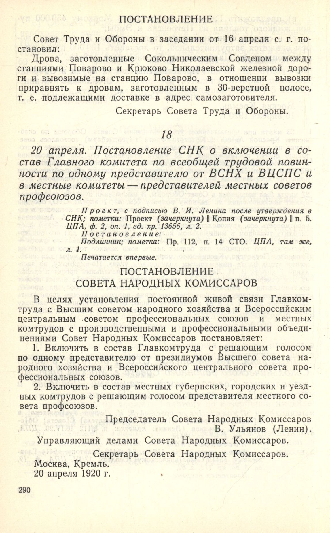 20 апреля. Постановление СНК о включении в состав Главного комитета по всеобщей трудовой повинности по одному представителю от ВСНХ и ВЦСПС и в местные комитеты — представителей местных советов профсоюзов // П р о е к т, с подписью В. И. Ленина после утверждения в СНК; пометки: Проект (зачеркнута) || Копия (зачеркнута) || п. 5. ЦПА, ф. 2, оп. 1, ед. хр. 13656, л. 2. П о с т а н о в л е н и е: Подлинник; пометка: Пр. 112, п. 14 СТО. ЦПА, там же, л. 1. Печатается впервые.