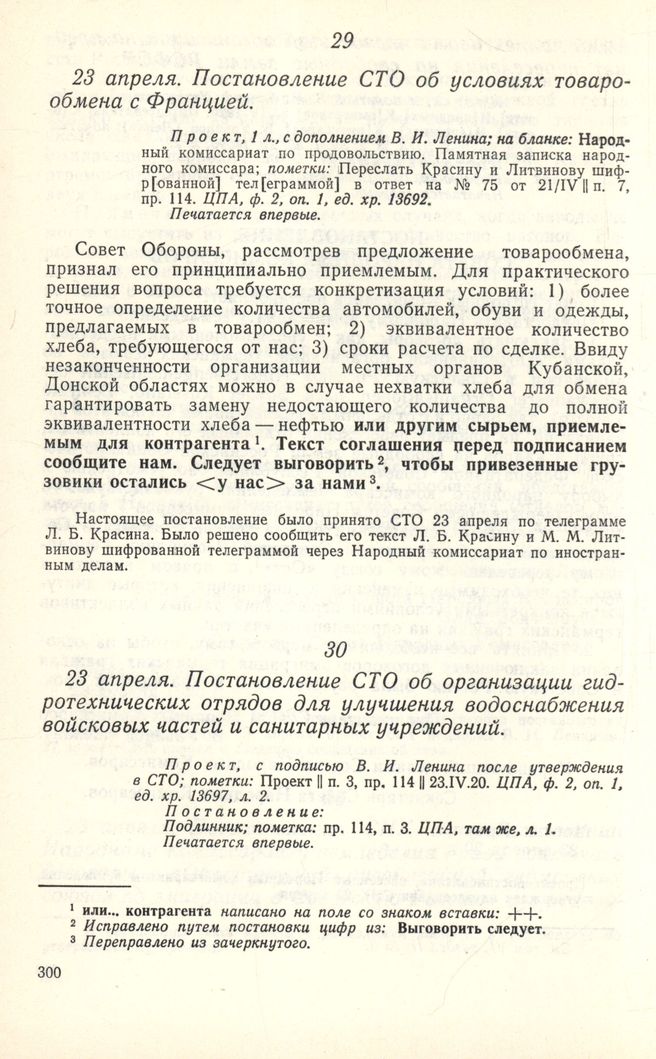 23 апреля. Постановление СТО об организации гидротехнических отрядов для улучшения водоснабжения войсковых частей и санитарных учреждений // П р о е к т, с подписью В. И. Ленина после утверждения в СТО; пометки: Проект || п. 3, пр. 114 || 23.1V.20. ЦПА, ф. 2, оп. 1, ед. хр. 13697, л. 2. П о с т а н о в л е н и е: Подлинник; пометка: пр. 114, п. 3. ЦПА, там же, л. 1. Печатается впервые.