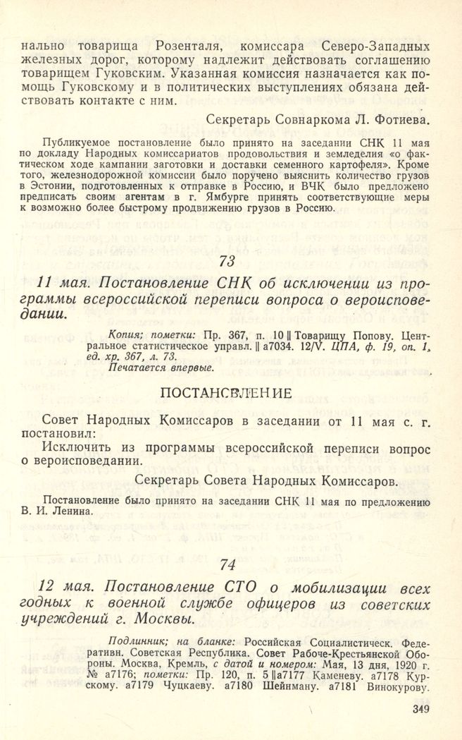 11 мая. Постановление СНК об исключении из программы всероссийской переписи вопроса о вероисповедании // Копия; пометки: Пр. 367, п. 10 || Товарищу Попову. Центральное статистическое управл. || а7034. 12/V. ЦПА , ф. 19, оп. 1, ед. хр. 367, л. 73. Печатается впервые.