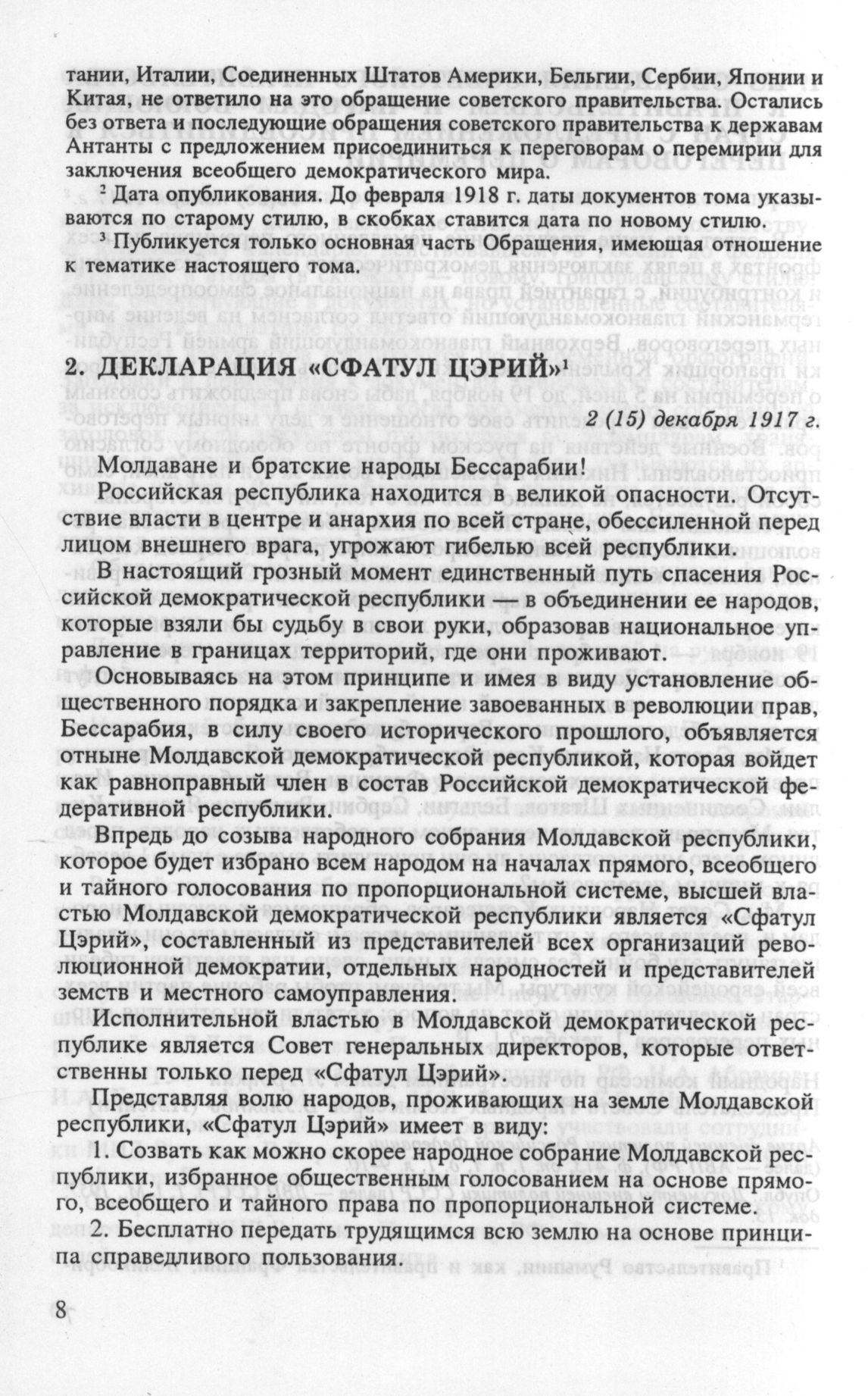 Декларация «Сфатул Цэрий». 2(15) декабря 1917 г. // «Cuvant moldovenesc», Chisinau, anul IV, nr. 110, 6 decembrie 1917.