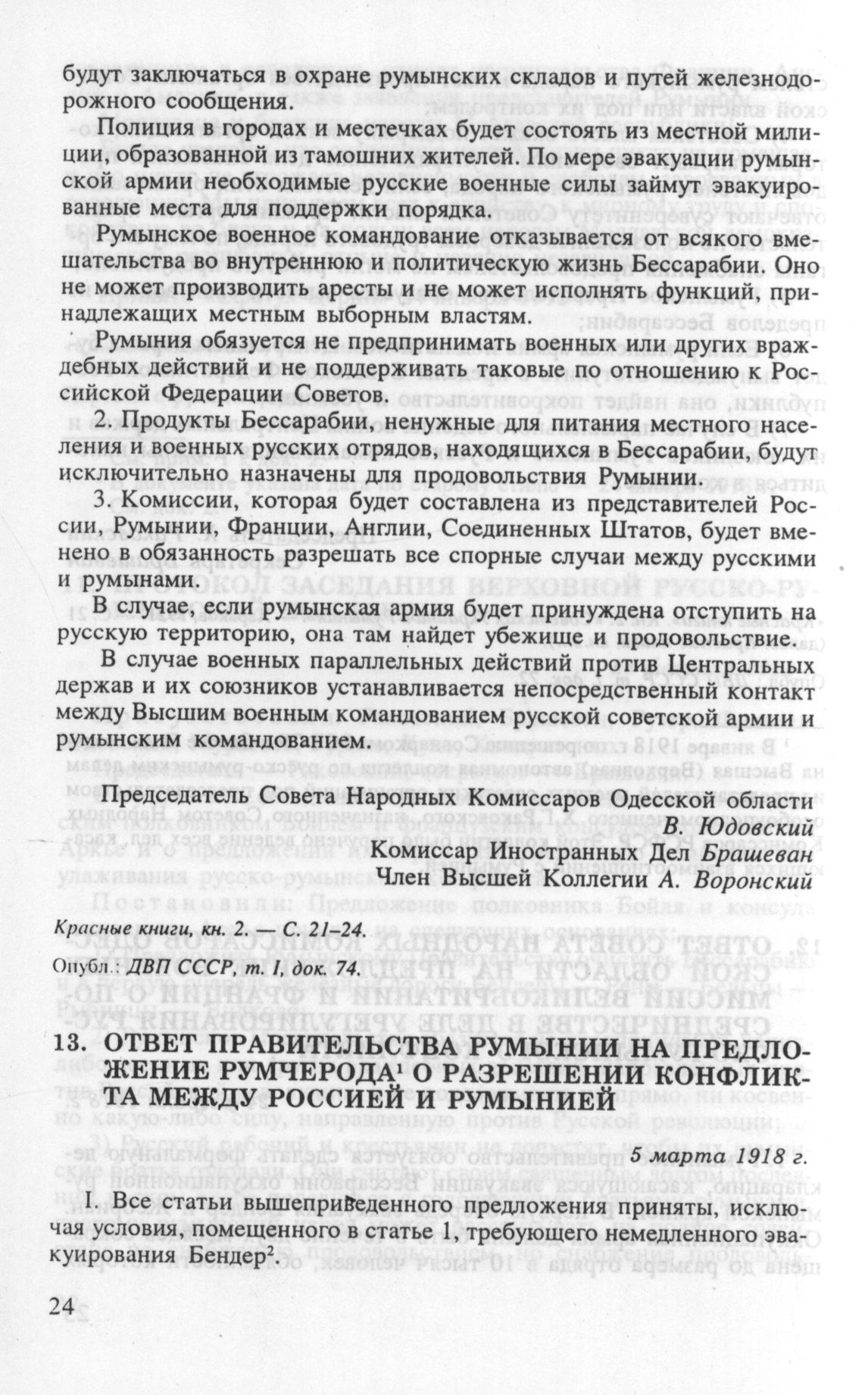 Ответ правительства Румынии на предложение Румчерода о разрешении конфликта между Россией и Румынией. 5 марта 1918 г. // А.МАЕ, fond 71/1914. E11/P. 1, vol. 20, f. 7-8. Опубл.: ДВП СССР, т. I, с. 115 (в сокр.).