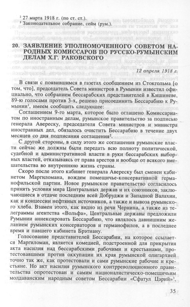 Заявление уполномоченного Советом Народных Комиссаров по русско-румынским делам Х.Г. Раковского. 12 апреля 1918 г.