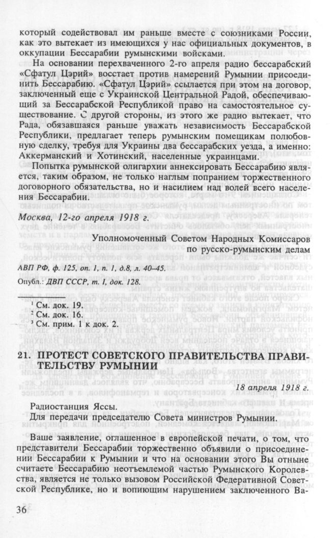 Протест советского правительства правительству Румынии. 18 апреля 1918 г. // АВП РФ, ф. 125, oп. 1, п. 1, д. 8, л. 34. Опубл.: ДВП СССР, т. I, док. 136.