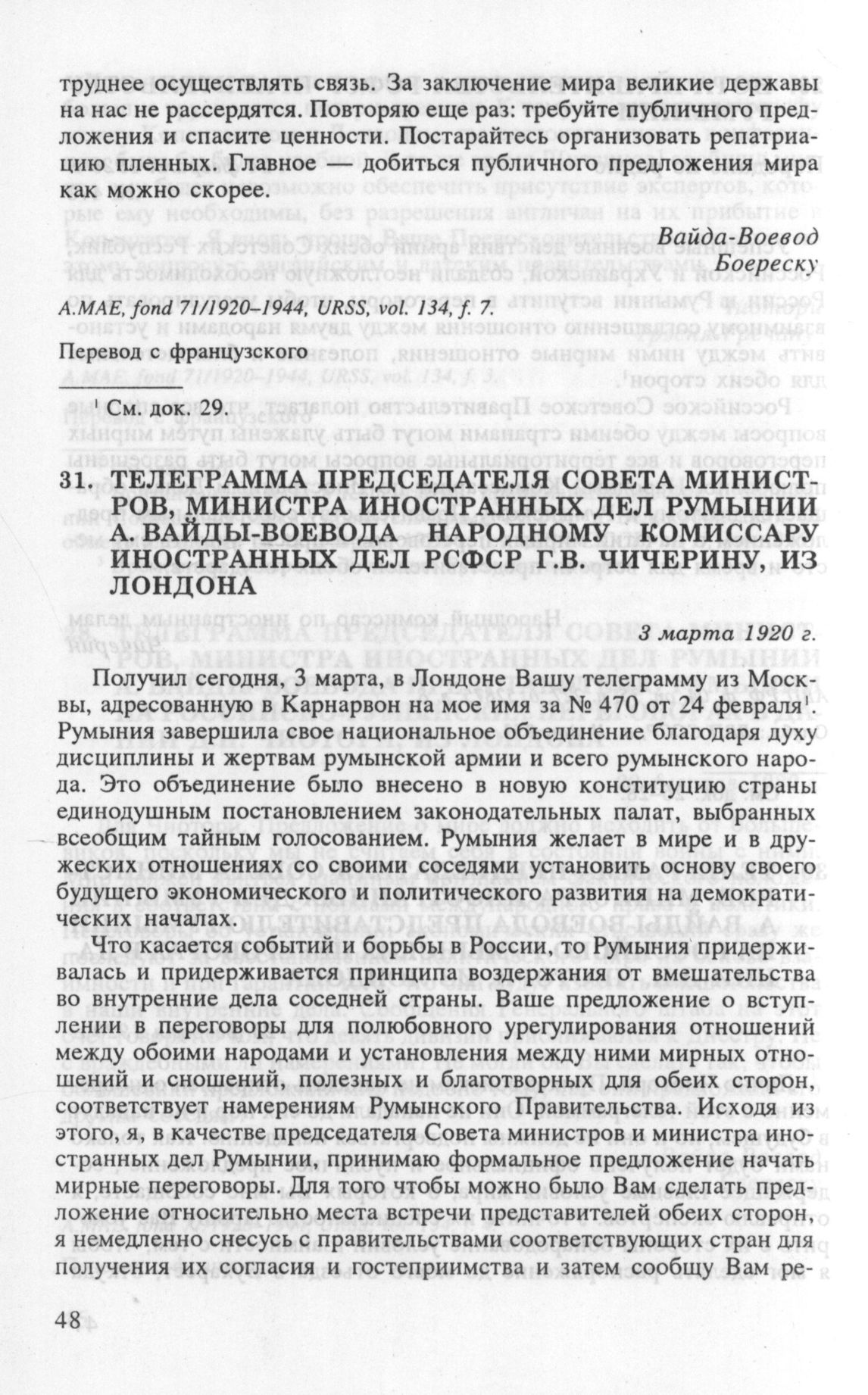 Телеграмма председателя Совета министров, министра иностранных дел Румынии А. Вайды-Воевода народному комиссару иностранных дел РСФСР Г.В. Чичерину, из Лондона. 3 марта 1920 г. // А.МАЕ, fond 71/1920-1944, URSS, vol. 42, f. 45-46. Опубл.: ДВП СССР, т. II, с. 403 (в сокр.).