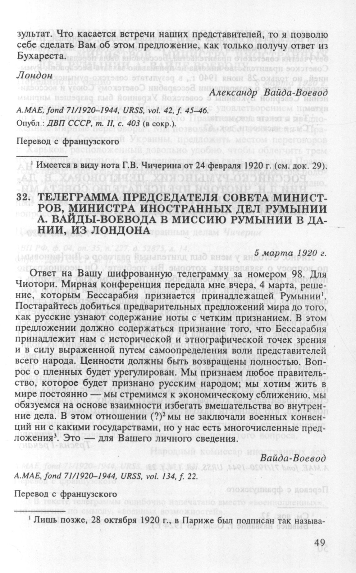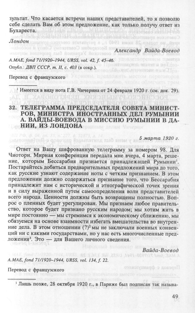 Телеграмма председателя Совета министров, министра иностранных дел Румынии А. Вайды-Воевода в миссию Румынии в Дании, из Лондона. 5 марта 1920 г. // А.МАЕ, fond 71/1920-1944, URSS, vol. 134, f. 22.