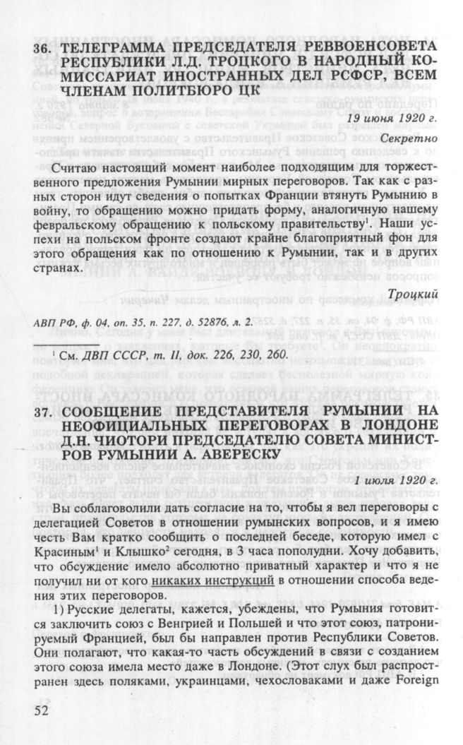 Телеграмма председателя Реввоенсовета республики Л.Д. Троцкого в Народный комиссариат иностранных дел РСФСР, всем членам Политбюро ЦК. 19 июня 1920 г. // АВП РФ, ф. 04, oп. 35, п. 227, д. 52876, л. 2.