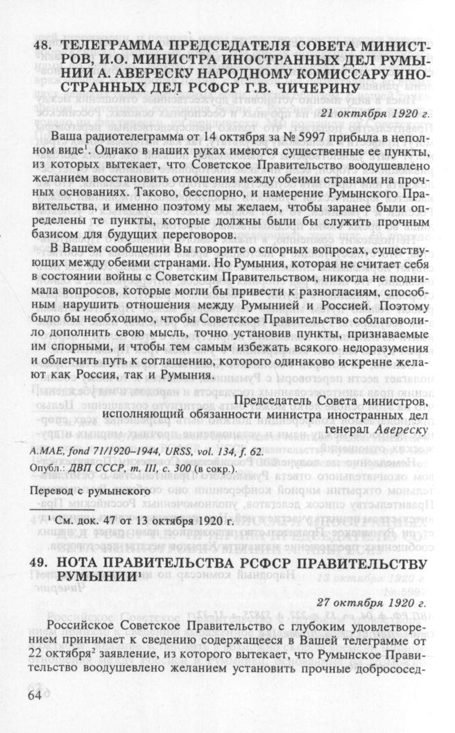Телеграмма председателя Совета министров, и.о. министра иностранных дел Румынии А. Авереску народному комиссару иностранных дел РСФСР Г.В. Чичерину. 21 октября 1920 г. // А.МАЕ, fond 71/1920-1944, URSS, vol. 134, f. 62. Опубл.: ДВП СССР, т. III, с. 300 (в сокр.).