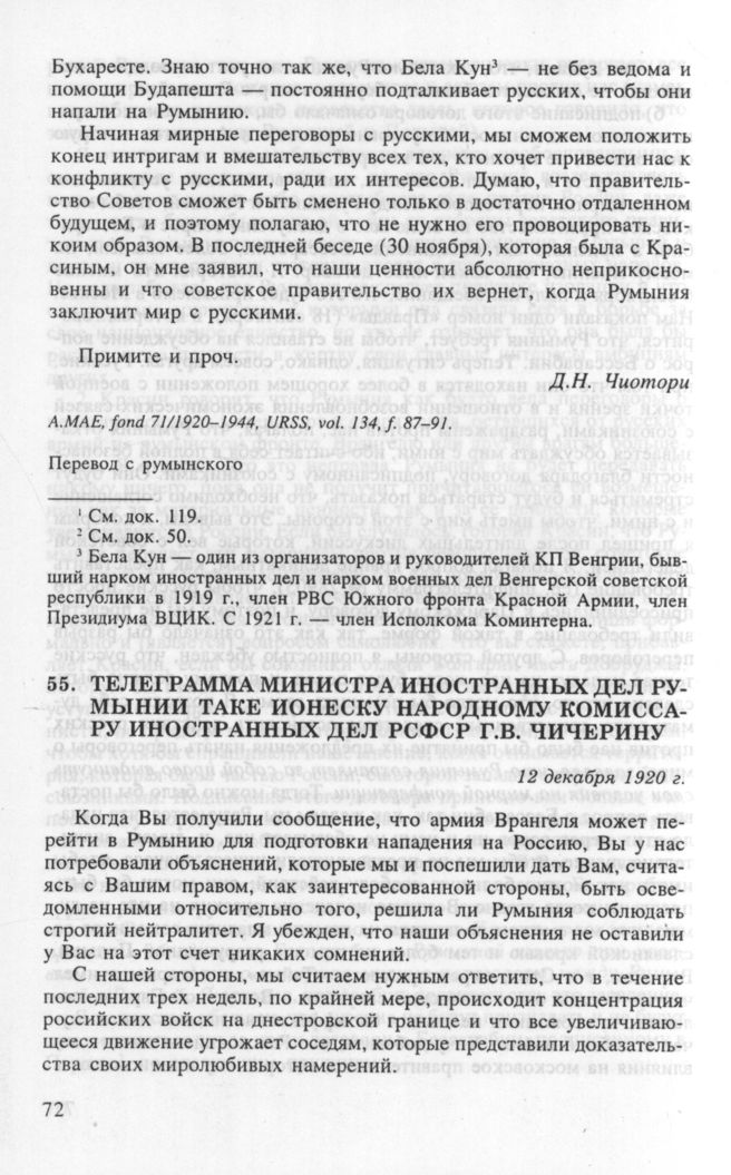 Телеграмма министра иностранных дел Румынии Таке Ионеску народному комиссару иностранных дел РСФСР Г.В. Чичерину. 12 декабря 1920 г. // А.МАЕ, fond 71/1920-1944, Dosare speciale, vol. 42, f. 243. Опубл.: ДВП СССР, т. Ill, с. 432 (в сокр.).