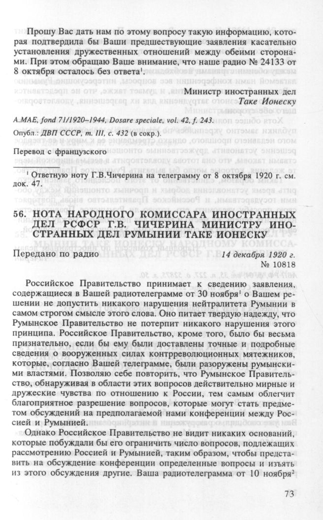 Нота народного комиссара иностранных дел РСФСФ Г.В. Чичерина министру иностранных дел Румынии Таке Ионеску. 14 декабря 1920 г. // АВП РФ, ф. 04, oп. 35, п. 227, д. 52875, л. 50. Опубл.: ДВП СССР. т. Ill, док. 221.