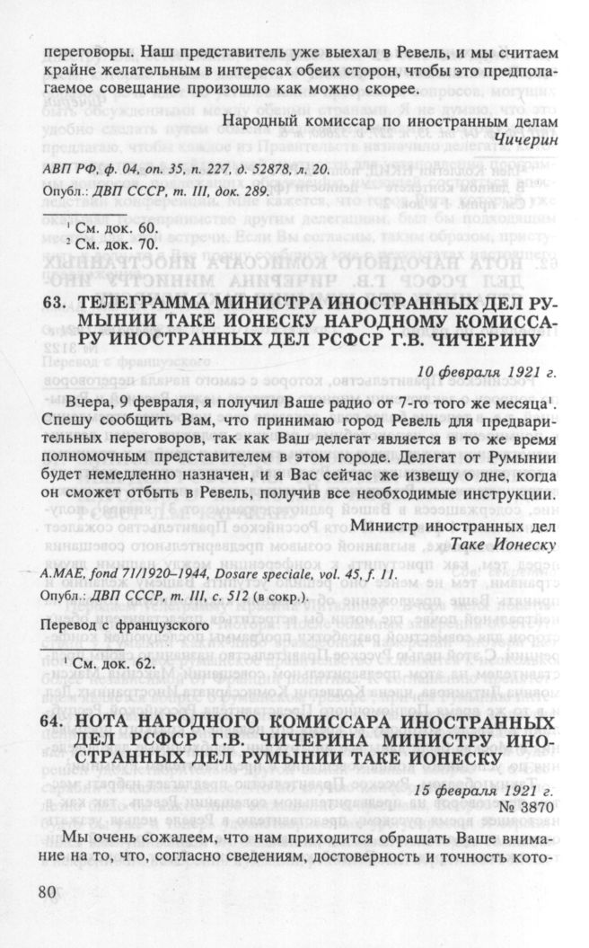 Нота народного комиссара иностранных дел РСФСР Г.В. Чичерина министру иностранных дел Румынии Таке Ионеску. 15 февраля 1921 г. // АВП РФ, ф. 04, oп. 35, п. 228, д. 52882, л. 10. Опубл.: ДВП СССР, т. Ill, док. 295.
