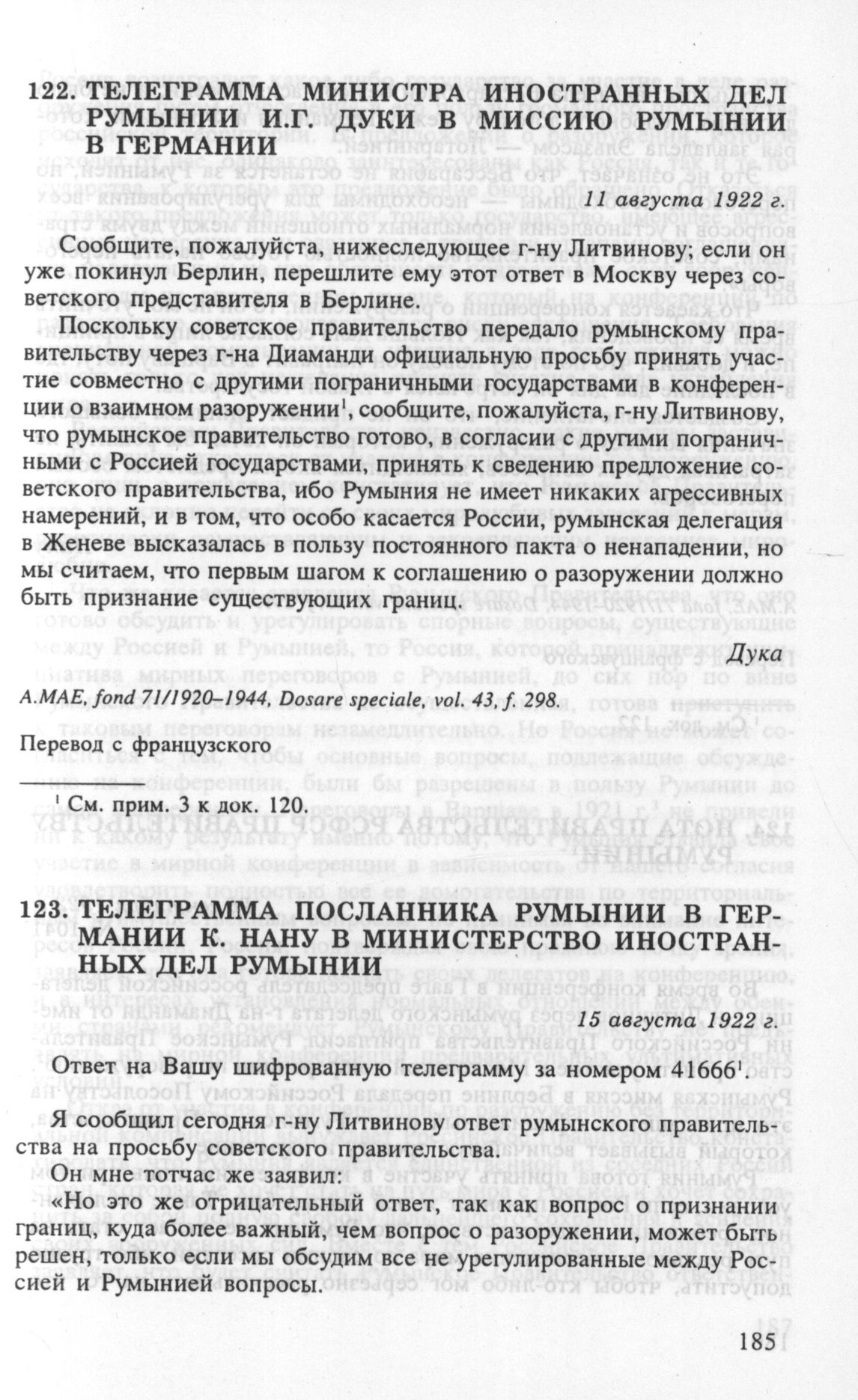 Телеграмма посланника Румынии в Германии К. Нану в Министерство иностранных дел Румынии. 15 августа 1922 г. // А.МАЕ, fond 71/1920-1944, Dosare speciale, vol. 43, f. 299.