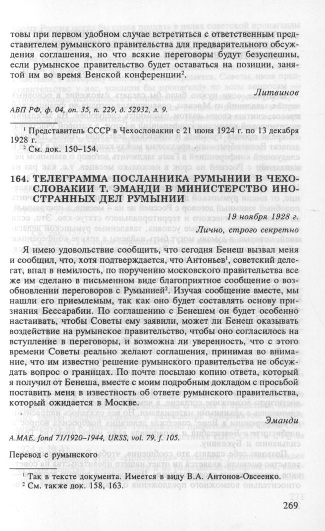 Телеграмма посланника Румынии в Чехословакии Т. Эманди в Министерство иностранных дел Румынии. 19 ноября 1928 г. // А.МАЕ, fond 71/1920-1944, URSS, vol. 79, f. 105.