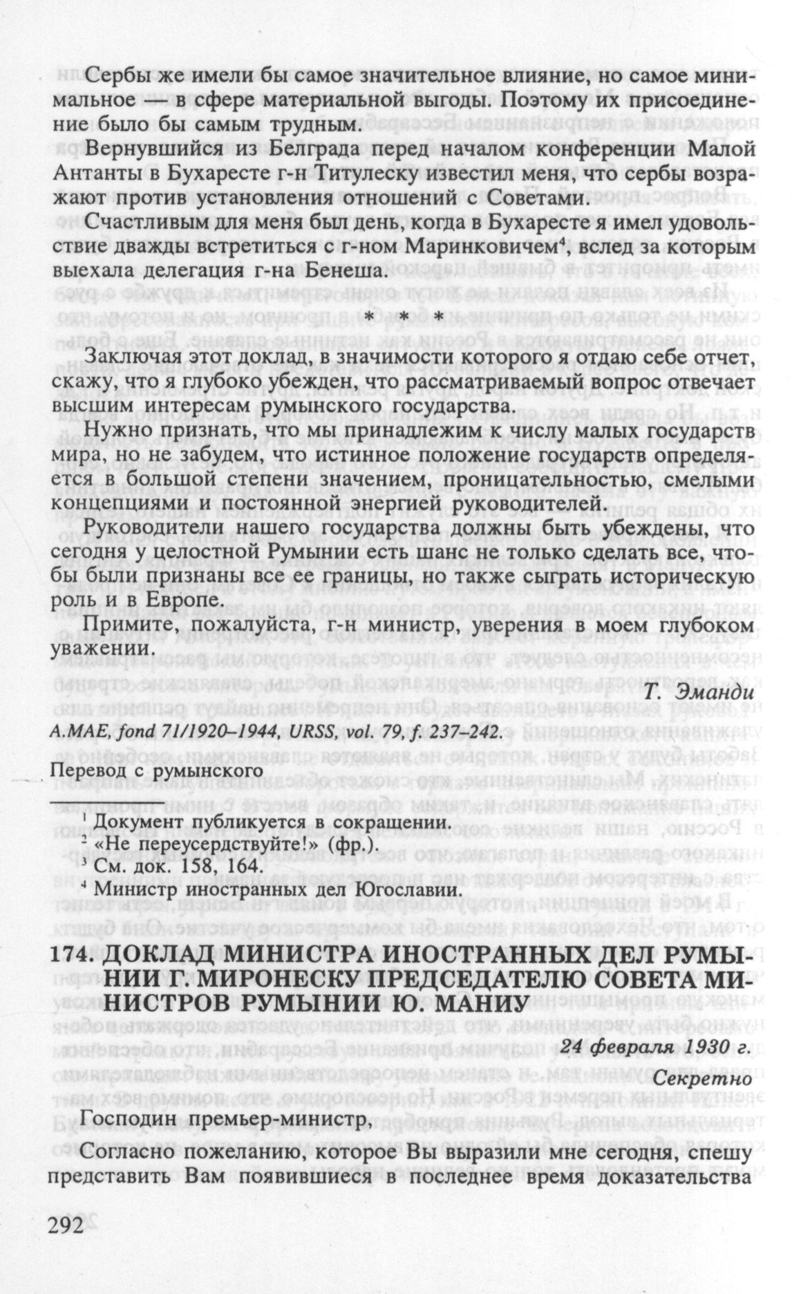 Доклад министра иностранных дел Румынии Г. Миронеску председателю Совета министров Румынии Ю. Маниу. 24 февраля 1930 г. // А.МАЕ, fond 71/1920-1944, URSS, vol. 80, f. 58-65.