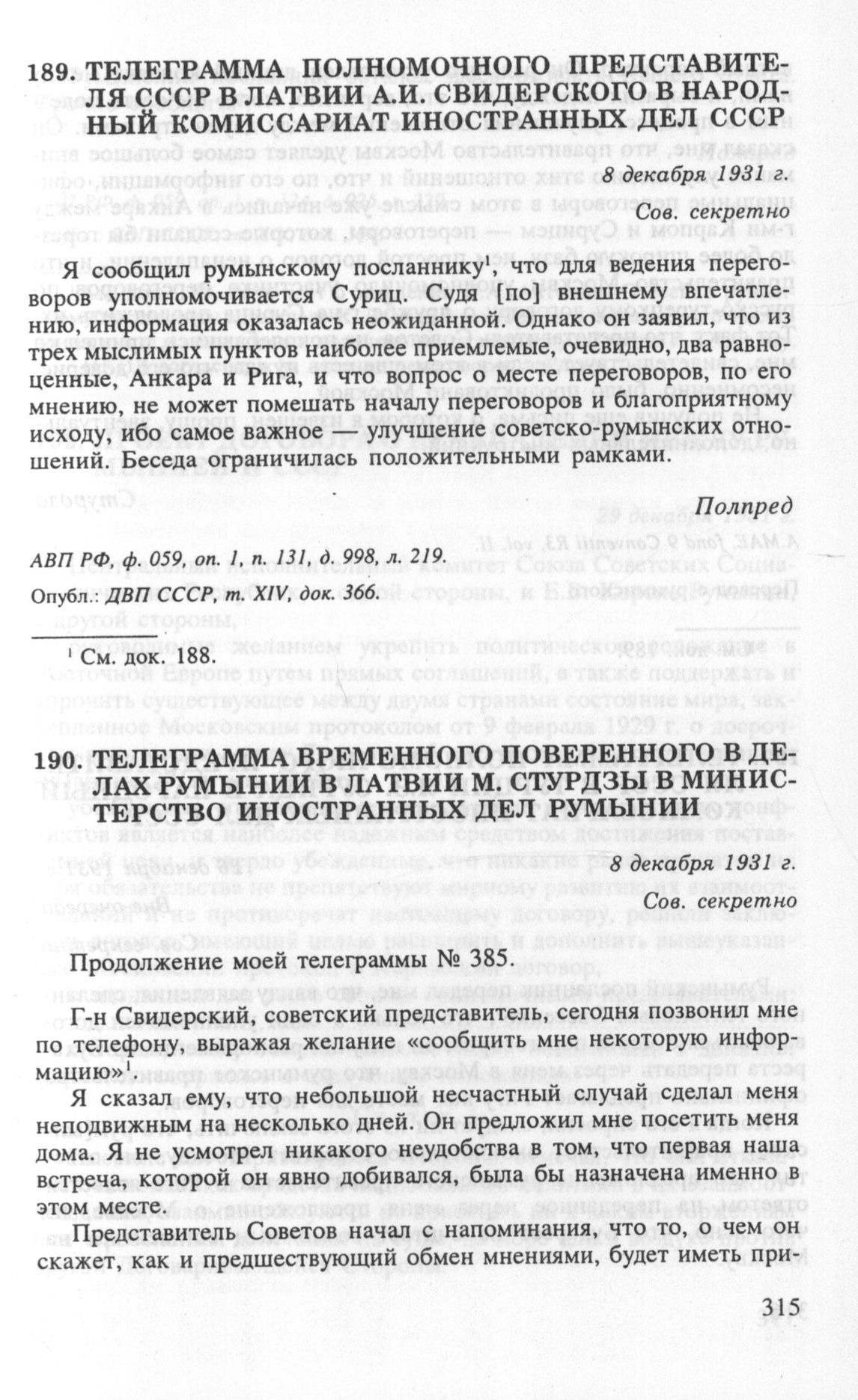 Телеграмма полномочного представителя СССР в Латвии А.И. Свидерского в Народный комиссариат иностранных дел СССР. 8 декабря 1931 г. // АВП РФ, ф. 059, oп. 1, п. 131, д. 998, л. 219. Опубл.: ДВП СССР. т. XIV, док. 366.