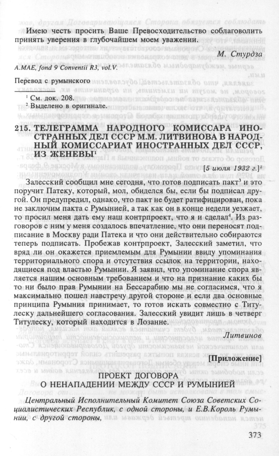 Телеграмма народного комиссара иностранных дел СССР М.М. Литвинова в Народный комиссариат иностранных дел СССР, из Женевы. [5 июля 1932 г.] // АВП РФ, ф. 059, oп. 1, п. 140, д. 1069, л. 170; ф. 05, oп. 12, п. 86, д. 70, л. 149-151. Опубл.: ДВП СССР, т. XV, док. 273.