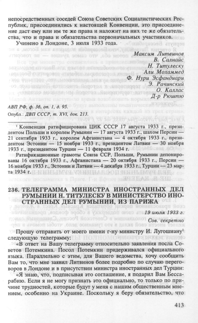Телеграмма министра иностранных дел Румынии Н. Титулеску в Министерство иностранных дел Румынии, из Парижа. 19 июля 1933 г. // А.МАЕ, fond 71/1920-1944, URSS, vol. 82, f. 92-93.